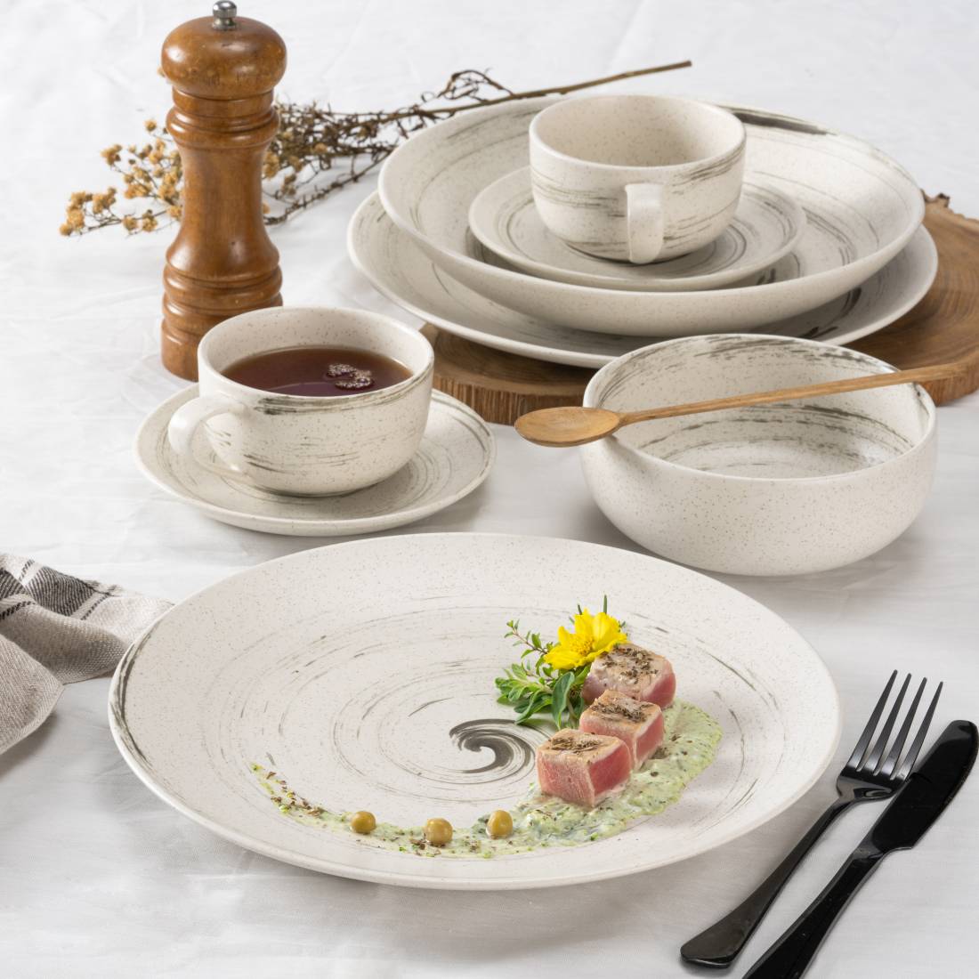The Angin Mamiri Collection from ZEN Horeca is a versatile range of tableware ideal for main courses, appetizers, and desserts, perfectly suited for Japanese, Indonesian, Thai, Vietnamese, Chinese, or any other Asian cuisines. Highly recommended for cafes, bistros, fine, casual, and all-day dining, the matte white color with a brown swirl in the inner part of the plates enhances the visual appeal of dishes, making them look more appetizing and sophisticated. The tableware is stackable and crafted with high durability, ensuring practicality and longevity.