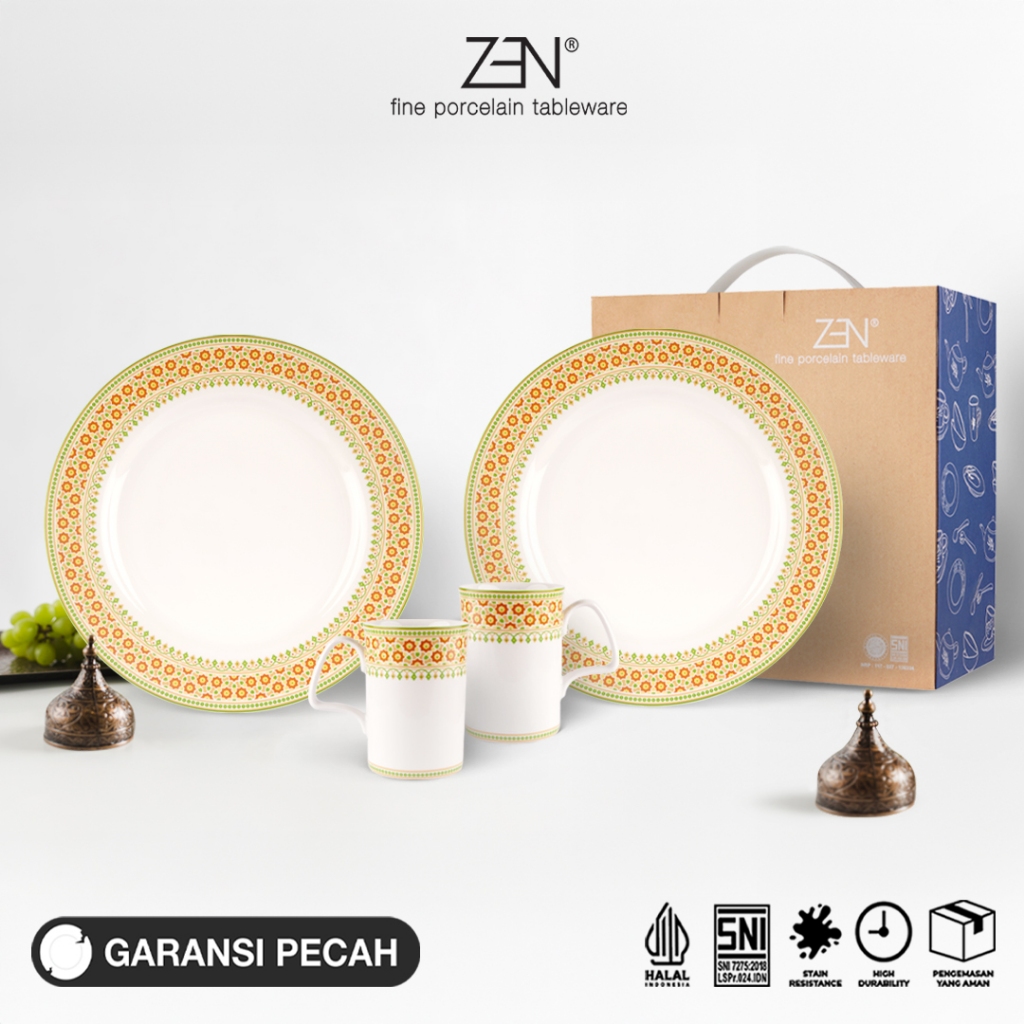 Koleksi ZEN dikenal memiliki desain yang simple, modern dengan bentuk yang elegan. Diproduksi dari bahan porcelain kualitas tinggi, menjadikan produk ini lebih kuat dan tahan lama dengan hasil finishing yang halus, putih bersih. Produk ini bersertifikasi SNI, Halal, dan Food Grade serta aman digunakan di microwave, dishwasher, dan freezer.