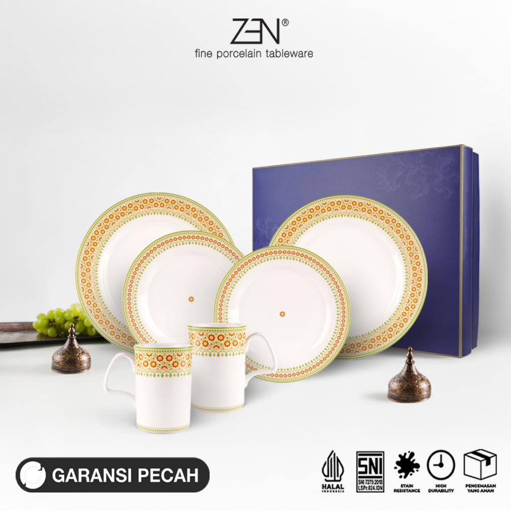 Koleksi ZEN dikenal memiliki desain yang simple, modern dengan bentuk yang elegan. Diproduksi dari bahan porcelain kualitas tinggi, menjadikan produk ini lebih kuat dan tahan lama dengan hasil finishing yang halus, putih bersih. Produk ini bersertifikasi SNI, Halal, dan Food Grade serta aman digunakan di microwave, dishwasher, dan freezer.