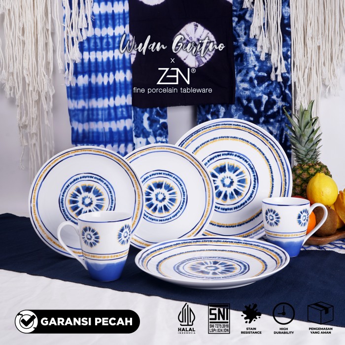 ZEN Tableware dan Wulan Guritno menghadirkan produk yang fresh dalam kolaborasi perdana dengan tema Tie dye. Koleksi kolaborasi BLISSFUL ASHA by Wulan Guritno yang merupakan karya kolaborasi perdana ZEN dengan Wulan Guritno ini mengusung motif Tie Dye yang lekat dengan dunia fashion, Tie Dye yang naik daun Kembali di awal pandemi ini di pilih Wulan untuk motif karya tableware pertamanya bersama ZEN Tableware,BLISSFUL ASHA by Wulan Guritno hadir dalam dua pilihan koleksi yaitu BLISSFUL ASHA by Wulan Guritno dan BLISSFUL SPLASH by Wulan Guritno, dengan dominasi biru dan aksen gold yang mewah BLISSFUL ASHA by Wulan Guritno sangat cocok dipadu-padankan dengan dekorasi rumah modern dan minimalis. Hadirkan sentuhan elegan dan ketenangan di ruang makan dengan BLISSFUL ASHA by Wulan Guritno. Perpaduan warna biru yang tenang dan detail emas mewah menciptakan suasana harmonis yang dapat mengubah ruang makan Anda menjadi lebih hangat. Wulan sengaja mendesain koleksi nya agar Fleksibel dan mudah dipadu padankan untuk menciptakan suasana yang unik dan personal.